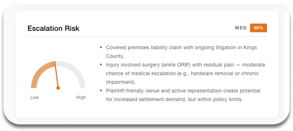 The Escalation Risk view identifies early indicators that a claim may deteriorate, expand in scope, or become more complex over time. It highlights patterns and signals that historically lead to higher severity, litigation, or prolonged resolution, allowing teams to intervene before risk compounds.